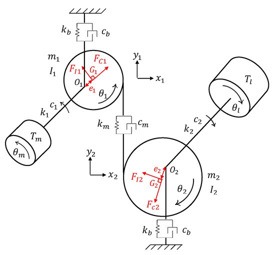 Then, Newton’s second law is employed to derive the spur gear dynamic model of Figure 7. For simplification, the LOA direction is assumed to be unchanged in this part of the model, which is justified because we have in this study. The reference frame of study is chosen such as the y axis is aligned with the line of action direction as shown in Figure 7, where is the rotation center and is the geometric center of the gear i.