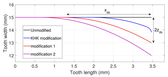 - Gear tooth with the first proposed modification, a quadratic reduction is proposed with parameters: and , where is the modification length and is the modification depth;