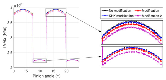 First, the developed model is used to simulate the gear tooth width modification effect on the final TVMS. Four different configurations were proposed as follows (see Figure 8):