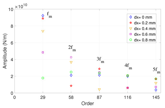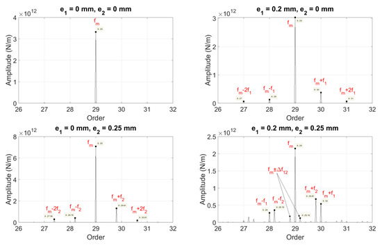 To better illustrate the effect of the eccentricity error in the TVMS, we represented its order spectrum with respect to the pinion rotation angle. To consider the double-eccentricity in the system, the TVMS of the system was calculated in 36 rounds of the pinion which corresponds to a complete period and, for comparison, the remaining configurations were calculated for the same period. Figure 16 shows a close-up of the order spectrum around the fundamental mesh frequency .