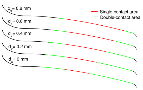 Figure 12 shows the effect of the center distance error in the working part of the gear tooth flank and the distribution of the single-contact and double-contact areas. When the center distance error increases, we can see that the total active area of the tooth flank is reduced, the single-contact area increases and the double-contact area decreases. In addition, one can see that the critical part of the gear tooth moves to the tooth tip direction for greater values of the center distance error; this is very important to note, because almost all methods used for gear strength calculation are based on the location of this critical zone.