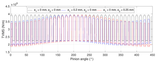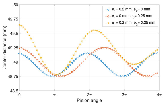 Different configurations of this error are proposed: eccentricities in the pinion, in the gear and in both the pinion and gear and the corresponding impact in the final mesh stiffness are determined. Figure 13 represents the center distance variation with respect to the pinion rotation angle for the three different scenarios considered in this study, an eccentricity of for the pinion and for the gear were considered.