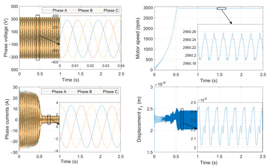 The model equations are implemented at Simulink to simulate the electromechanical model response. Figure 17 represents the supply voltage signals, the motor current speed, the developed phase currents and the first pinion displacement .