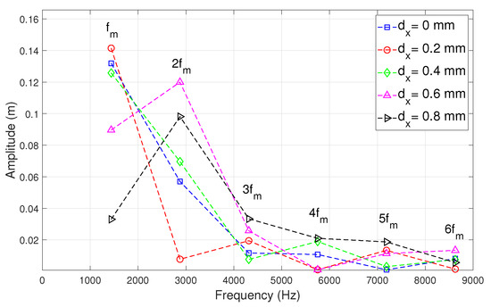 Figure 18 represents the first harmonics of the mesh frequency of the displacement signal spectrum for different stages of the center distance error. We can see that the center distance error value has a direct impact on the total behavior of the displacement spectrum. Consequently, analyzing the form of the signal spectrum could help to detect the presence of the center distance error in the gear system.