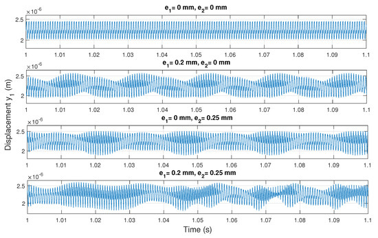 Figure 19 illustrates the first pinion displacement for the different configurations of eccentricity error considered in this study. One can see that the presence of an eccentricity error causes a modulation of the displacement signal with the eccentric gear rotation frequency.