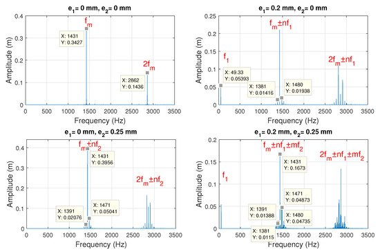 Analyzing the displacement signal spectrum represented in Figure 20 allows us to extract the modulation frequencies at each case. As shown in this figure, the eccentricity error leads to a raising of side band peaks around the mesh frequency and its harmonics, distant with the defected gear frequency or depending on which gear is defected (the mesh frequency is theoretically calculated using the rotation frequency and the number of teeth: , where are determined from the model resolution ). In addition, we can see the apparition of the pinion rotation frequency when it is eccentric because the signal is taken at the pinion position.
