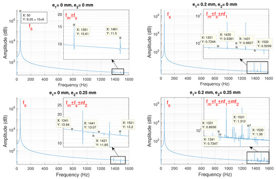 To show the eccentricity error effect on the system electrical response, the first phase current spectrum is represented in Figure 21. We can see that in addition to the supply frequency , the mesh frequency and its harmonics are also modulated by the eccentric gear rotation frequencies and .