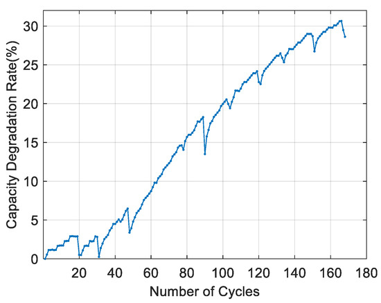 In Figure 1, the abscissa is the number of LIB charge–discharge cycles. The ordinate is the capacity degradation rate. Obviously, the degradation process of an LIB is a combination of multiple curves rather than a complete curve. Assuming that capacity regeneration is eliminated, the degradation process of an LIB can be regarded as several normal degradation stages.