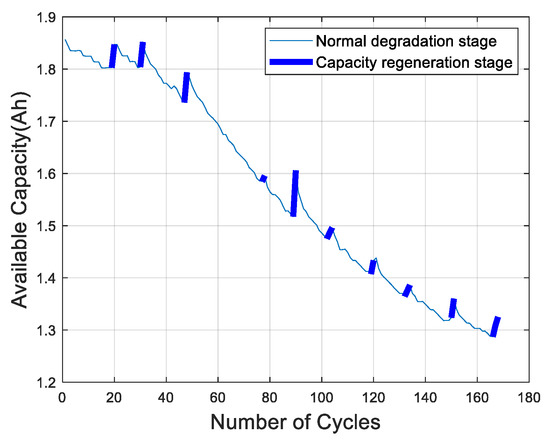 In Figure 2, the abscissa is the number of charge–discharge cycles. The ordinate is the available capacity value. The bold curve is the capacity regeneration stage, which makes the degradation process of the LIB nonlinear. If this stage is ignored, the modeling accuracy will be reduced, and the available capacity prediction error for the LIB will be increased.