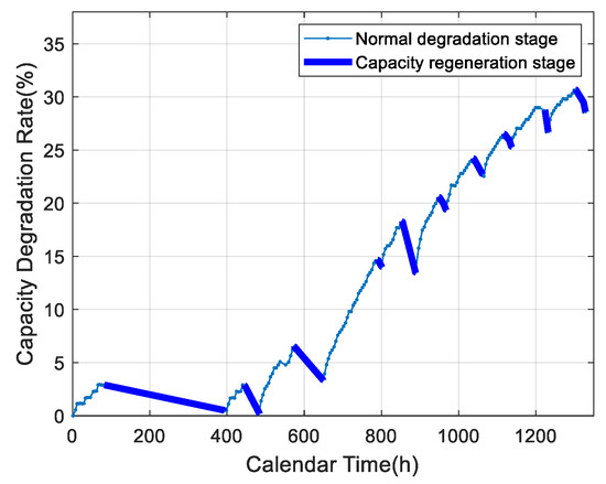 LIB aging is usually caused by the growth of solid electrolyte interface (SEI) film [24]. This process will reduce the available capacity of an LIB [25]. However, in the aging process of an LIB, the available capacity is not monotonously decreasing, but undergoing a process of sudden increase and slow decrease alternately. Therefore, this paper divides the LIB degradation process into a normal degradation stage and a capacity regeneration stage.