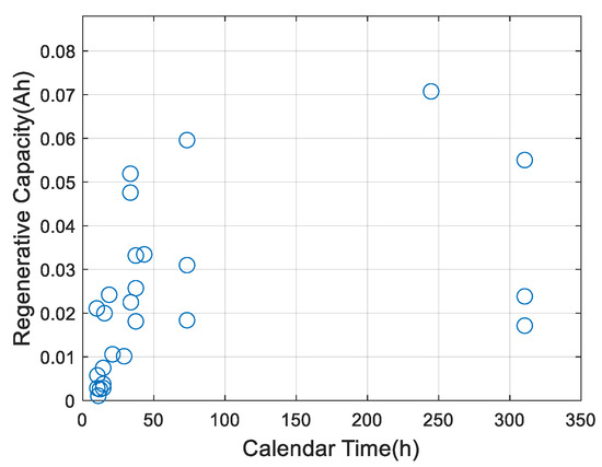 In Figure 5, the abscissa is the calendar time and the ordinate is the regeneration capacity value. Although the capacity regeneration value is positively correlated with calendar time, there is a non-linear relationship between the two. To express the relationship between the two more accurately, we use a power function curve to approximate the relationship between the capacity regeneration value and the calendar time.