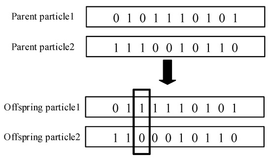 The crossover operation refers to randomly pairing the parent particles. The two particles exchange part of their genes in a single-point or multi-point manner to form two new offspring particles. In this paper, the crossover method is the single point crossover, as shown in Figure 7. By performing this operation, the search ability of the genetic algorithm can be greatly improved.