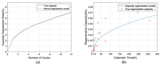 In Table 1, are parameters of the normal degradation model, and are parameters of the capacity regeneration model. According to the estimated parameters, the normal degradation model curve and the capacity regeneration model curve can be obtained, as shown in Figure 8.