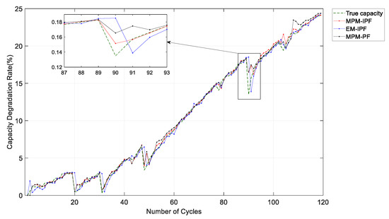 Obviously, in Figure 8a, the normal degradation model curve is very close to the true value, which reflects the superiority of the model in Figure 8b, because capacity regeneration is a complex chemical reaction and there are errors in capacity measurement. There is a certain error between the capacity regeneration model and the true value. Using the obtained model parameters and the current calendar time, we can estimate the next capacity degradation rate. In this paper, the data on No. 6, No. 7, and No. 18 batteries were used to identify the parameters of a capacity regeneration model to predict the capacity degradation rate of the No. 5 battery. To verify the superiority of the method, the improved particle filtering method based on an empirical model (EM-IPF) and the particle filtering method based on a multi-stage prediction model (MPM-PF) were compared with the proposed improved particle filtering method based on a multi-stage prediction model (MPM-IPF).
