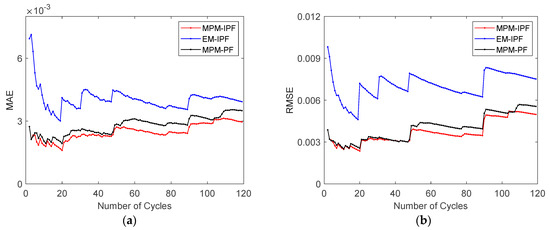 To compare the performance of the proposed MPM-PF with other algorithms (such as EM-IPF and MPM-PF), the error results of MPM-PF, EM-IPF, and MPM-PF were compared. Figure 10 describes the MAE and RMSE results of the above three methods for the capacity prediction error of the No. 5 battery. Table 2 shows the detailed capacity prediction error results of different prediction methods at 30, 60, and 90 cycles. The three error curves shown in Figure 10 increase sharply in the capacity regeneration stage due to the deviation between the predicted value and the true value. However, obviously, in the capacity regeneration stage, the MAE and RMSE values of the MPM-IPF method proposed in this paper are significantly smaller than those of the EM-IPF and MPM-PF methods. This demonstrates the prediction accuracy of the MPM-IPF method. Moreover, during the degradation process of an LIB, the MAE and RMSE values of the method proposed in this paper are lower than those of the comparison methods, and neither exceeds 0.6%. Once again, this proves the superiority of the MPM-IPF method.