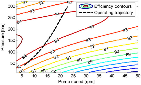 where , , and are the total, mechanical, and volumetric efficiency of the pump, and A is a dimensionless factor. Figure 2 shows the efficiency contours of compatible piston pumps used in wind turbine applications at different pump speeds and pressure variations. In our prior study, the designed MPPT controller regulated the pump speed in order for it to operate on the optimal efficiency line (dotted line in Figure 2) [16]. This is attained provided that pump rotor speed/torque characteristics match. This ensured that the pump efficiency was in the range of 93–94%, which is the maximum attainable efficiency for the pump for the given operating conditions.