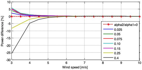 Next, the unconstrained optimal control law (25) was simulated in a closed loop with the HSWT plant model at various wind speeds and ratios. Again, a zero ratio indicates MPPT baseline simulation. The difference in power generation for different weighing ratios and the baseline is shown in Figure 7, where the trend of output power variation is similar to that observed in the PMP control law results shown in Figure 5. It can also be observed here that a slightly improved output power can be achieved by increasing the weighing ratio up to 0.3 in this case. For higher weighing ratios, the trend of power difference becomes reversed.