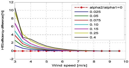 Figure 6 shows the HTS efficiency differences between the PMP optimal control and the baseline MPPT control at various ratios. It can be observed that at low wind speeds, the HTS efficiency is significantly higher compared to the MPPT baseline. At low wind speeds, higher ratios improve the hydrostatic efficiency. This can be explained by referring to Figure 2 and Figure 3; at higher wind speeds, the turbine speed increases resulting in increased pump speed. According to Figure 2 the pump discharge pressure would increase, resulting in higher system pressure. As a result, the motor pressure increases giving rise to motor efficiency. The gradient of motor efficiency is higher at low wind speeds, so even slightly higher pressure improves the efficiency noticeably. For moderate-to-high wind speeds, the efficiency of the motor reaches its maximum value. Another observation is that for the whole range of wind speeds, there is a trade-off between maximum power harvesting at the rotor (MPPT) and maximum efficiency of the hydrostatic transmission. So by choosing the ratio appropriately at low and moderate-to-high wind-speed ranges, it would be possible to have the entire HSWT plant operate optimally.