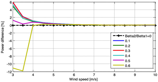 The constrained optimization control law (20) was first simulated with closed loop control on the HSWT plant model at various wind speeds for different ratios. The results are captured in Figure 5, which shows the output power difference (percent) between the PMP-controlled HTS and the baseline (with only MPPT control) at different wind speeds. It can be observed from this figure that for values of up to 0.1, the output power shows a slight increase. However, for higher ratios, the output power actually decreases. Figure 5 also shows that the output power does not change with the weighing ratios for medium-to-high wind-speed ranges. The best ratio of maximum overall HSWT efficiency can be observed at 0.1.