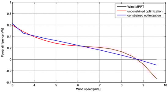 To further compare improvements between the PMP control law (20) and the unconstrained controller (25), the best weighing ratio for each controller was chosen (in a low speed region). For the PMP control law, the best ratio was 0.1, while for the unconstrained optimal control, the ratio was 0.3. The differences in power output for each controller at their respective best weighing ratios with respect to the MPPT baseline are shown in Figure 8. It can be observed that the output power difference for the optimal controller that minimizes the overall loss (PMP or unconstrained) and the baseline MPPT is positive in low wind-speed regions. At very low wind speeds (3–4 m/s) both constrained and unconstrained controllers perform about the same. At higher speeds (4–6 m/s) constrained controller has a little advantage over unconstrained one. In the wind-speed region of 6–9 m/s, the unconstrained controller offers better results with respect to power output.
