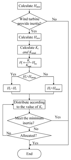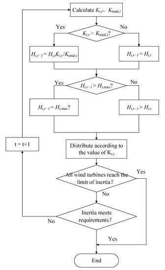 According to (21), is assigned to the corresponding wind turbine inertia time constant in turn. If the current total inertia satisfies Equation (9), the remaining wind turbines in the system will no longer provide an inertia response. The initial allocation process of wind turbine inertia is shown in Figure 3.