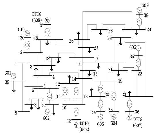 A modified IEEE 39-bus New England system was built as shown in Figure 5 [24]. The main parameters are shown in Table 1. The frequency of this model was set to 60 Hz. In the simulation system, G03, G07, and G08 are wind farms, which are composed of 130 DFIGs, 112 DFIGs, and 108 DFIGs, respectively. The rated capacity of a single DFIG is 1.67 MVA, and the rated output power is 1.5 MW. The speed of each wind turbine in the system is shown in Table 2. The load shedding in Table 2 is the percentage reduction in the output power of the wind turbine relative to the output power running in the MPPT mode at the wind speed. Since the output power of the wind turbines in the low-wind speed area is relatively small, no over-speed reduction was performed.