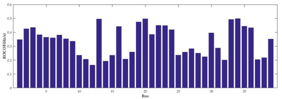 When the virtual inertia allocation method is used in all wind turbines, Figure 7 shows the ROCOF of each node because of a sudden load increase of 600 MW. The ROCOF at node 20 is the largest, 0.4995 Hz/s, which is slightly less than 0.5 Hz/s. That meets the minimum inertia requirement of the system.
