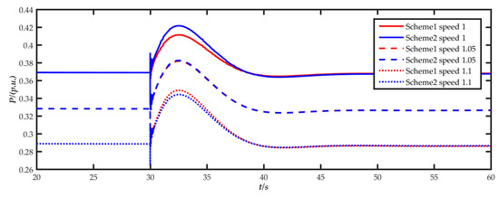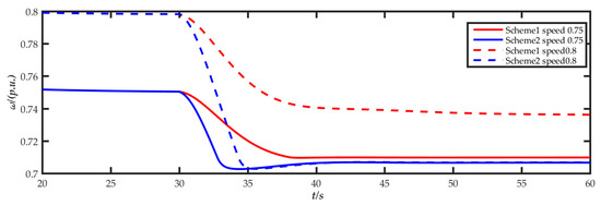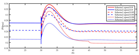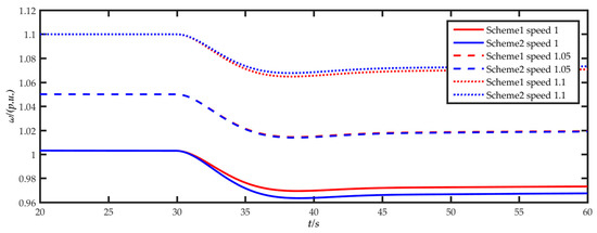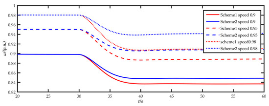 Figure 9, Figure 10, Figure 11, Figure 12, Figure 13 and Figure 14 show the speed and power changes in the wind turbines in the low-, medium-, and high-wind speed zones during the inertia response process. It can be seen from the figures that before the frequency reaches the lowest point the wind turbines in the low-wind speed zone of Scheme 2 excessively release kinetic energy and exit the inertia response prematurely, which brings a secondary impact to the system frequency. In Scheme 1, the inertia allocation is based on the inertia response capability of the wind turbines themselves. Compared with Scheme 2, the inertia provided by the wind turbines in the low-wind speed region is reduced, but the inertia provided by the wind turbines in the medium-wind speed region is significantly increased, and the inertia of the wind turbine in the high-wind speed region is equivalent. This allows the wind turbines in the medium-wind speed zone with the highest inertia response capability to undertake more inertia support tasks and release more kinetic energy to compensate for the decrease in the kinetic energy released by the wind turbines in the low-wind speed zone, in order to prevent the lower-speed wind turbines from reaching the lower speed limit and prematurely exiting the inertia response process. Additionally, this improves the inertia support effect of the wind turbines while avoiding the secondary impact on the system frequency.