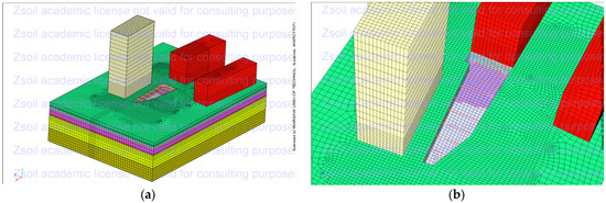 The spatial numerical models of the “subsoil—new building D—adjacent development” system, including building D and the adjacent development, were built in the ZSoil 2016 program by ZACE Services Ltd. [51,52,53].