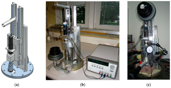 Drillability test stand: (a) 3D CAD model; (b) test stand with power supply and weights; (c) test stand during tests—dial indicator is used to measure drilling depth.