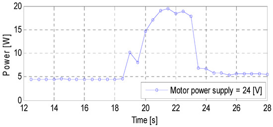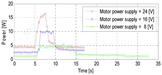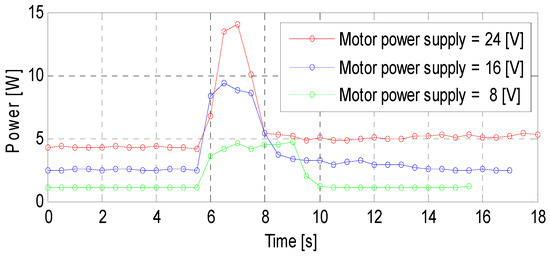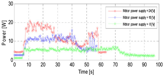 Power consumption during drillability test performed for Ytong (compression strength Re = 6 MPa) sample using Makita coring bit with motor’s power supply voltage 24, 16, and 8 V. WOB = 27.27 N.
