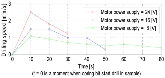 Drilling speed during drillability test performed for Ytong (compression strength Re = 6 MPa) sample using Makita coring bit with motor’s power supply voltage 24, 16, and 8 V. WOB = 27.27 N.