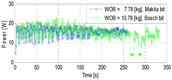 Power consumption during drillability test performed for Szydłowiec sandstone A—soft sample with motor’s power supply voltage 24 V, Makita and Bosch coring bits, weight on bit (WOB) 76.32 N and 105.75 N, respectively.