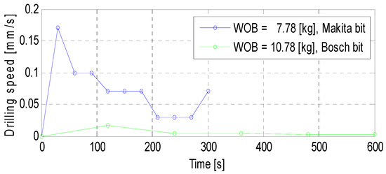 Drilling speed during drillability test performed for Szydłowiec sandstone A—soft sample with motor’s power supply voltage 24 V, Makita and Bosch coring bits, weight on bit (WOB) 76.32 N and 105.75 N, respectively.