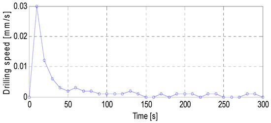 Drilling speed during Bosch coring bit test performed on Szydlowiec sandstone A—soft sample with motor’s power supply voltage 24 V and weight on bit (WOB) 105.75 N.