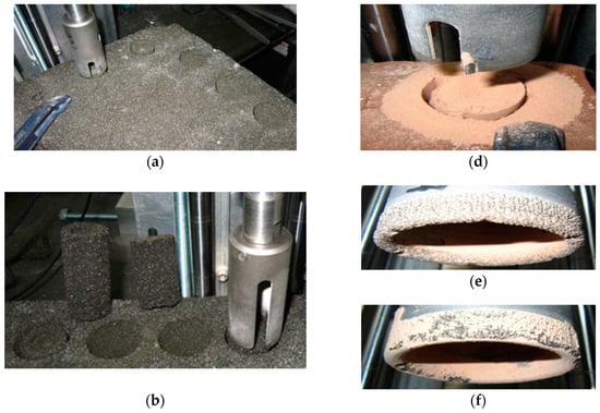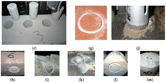 Drillability tests results: (a) for sample 1 (grey foamglas F) using Makita coring bit, WOB = 27.27 N; (b) for sample 2 (black foamglas F) using Makita coring bit, WOB = 27.27 N. Two collected cores visible in the picture; (c) for sample 4 (Ytong Rc = 6 MPa) using Makita coring bit, WOB = 27.27 N. Three collected cores visible in the picture; (d) for sample 5 (Szydłowiec sandstone A—soft), using Makita coring bit, WOB = 76.32 N. Drillability tests—Bosch coring bit tests: performed on sample 5 (Szydłowiec sandstone A—soft), WOB = 105.75 N: (e) Bosch coring bit cleaned before test; (f) Contaminations on Bosch coring bit matrix. Drillability tests results: obtained using Bosch coring bit, WOB = 105.75 N: (g) for sample 6 (Szydłowiec sandstone B—middle); (h) for sample 7 (Szydłowiec sandstone C—hard); (i) for sample 8 (massive reef limestone); (j) for sample 9 (bituminous shale)—drilling process; (k) for sample 9 (bituminous shale)—drilling effects; (l) for sample 10 (sandstone (core)); (m) for sample 11 (pudding stone).