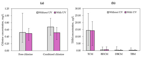 The average values of swimming pool water quality parameters with and without a UV lamp: (a) free and combined chlorine; and (b) trihalomethanes.