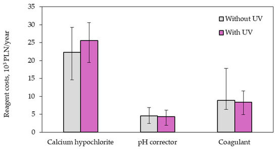As can be observed in Figure 3, while the UV lamp was switched on, higher costs of chlorine disinfectant were noted (by PLN 3335.66/year), although this was not a statistically significant difference. The increase in free chlorine consumption may be primarily caused by the increased reactivity of organic matter due to UV radiation [15], the direct photolysis of free chlorine, which leads to the formation of radicals HO• and Cl• may also have contributed to this, however, to a much smaller extent [2,16]. In the case of other reagents, the average costs of their consumption were very similar and amounted to PLN 4615.90/year for the variant without the UV lamp and PLN 4397.75/year for the variant with a UV lamp in the case of a UV corrector; and PLN 8949.19/year and PLN 8433.56/year in the case of the coagulant, respectively. Coagulant is dosed with an electric pump at a fixed dose and the higher consumption of this reagent was probably caused by the incidental increase in the coagulant dose by a pool operator. The pH corrector was dosed automatically, depending on the measurements of the pH-meter and—as can be observed in Figure 3—the application of UV lamp had no effect on the consumption of this reagent.