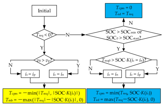- Braking: If the initial velocity v0 is bigger than the maximum speed vp which is corresponding to the positive gear of the power coupler, the power coupler shifts negative gear (transmission ratio is in), otherwise the coupler shifts positive gear (transmission ratio is ip). Besides, the brake torque is provided by ERS prior while the insufficient part is made up by mechanical braking (Tbm is the mechanical brake torque).