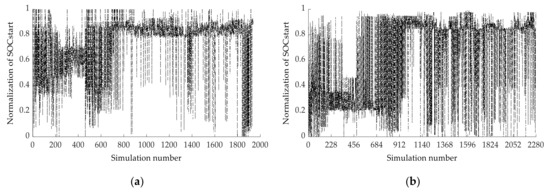 - Initial population and iter = 0, Flagcon = 0: A population is initialized randomly with the population size of 20. The differences between individuals in the population are the design parameters and the control parameter (ip, p1, V0, and SOCstart) after coding. In addition, the number of iterations iter and the number of convergence Flagcon are set to 0 in this step;