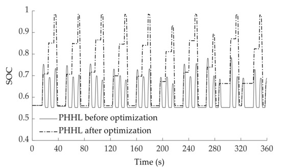 - Based on the V-type driving cycle, the optimal VDPM displacement is 180 mL/r, accumulator volume is 40 L, minimum working pressure p1 is 18 MPa, coupler transmission ratio ip is 2.73, and the optimal control variable SOCstart is 0.86. Optimization results of the PHHL demonstrated that development in fuel economy by 25% is obtained compared to that of the PHHL before optimization, which proved the effectiveness of the improved optimization algorithm.