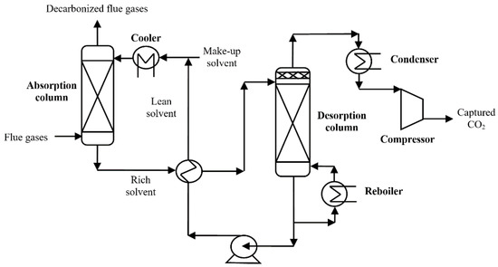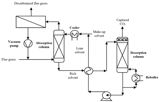 A conventional reactive absorption-desorption cycle for CO2 capture (considered as a benchmark concept for the hybrid cases) has the conceptual layout as presented in Figure 1 [14]. As can be noticed, the chemical solvent is contacted in the absorption column with flue gases, CO2 is chemically bound with the solvent (MDEA in this analysis) as presented in the next reaction: