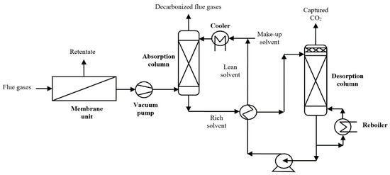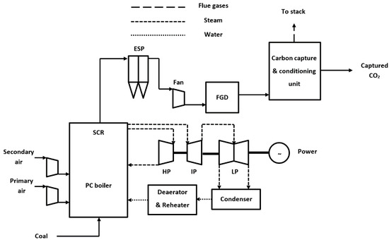 As a targeted industrial process to be decarbonized by hybrid solvent-membrane systems, a 1000 MW net output coal power plant was considered. The decarbonization yield is fixed to 90% similar to most of the CCS projects [16]. The design of decarbonized coal-based power plant is shown in Figure 6 [17]. As can be noticed, the flue gases resulted after coal combustion is subject to particulate matter, NOx, and SOx removal prior to CO2 capture either by chemical scrubbing, membrane, or hybrid systems.