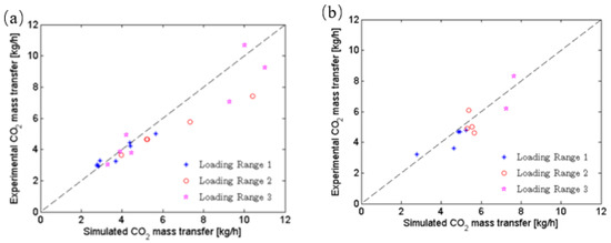 ChemCAD software was used for modeling and simulation of all investigated power plant concepts. The used thermodynamic models were in line with process conditions (involved chemicals, conditions etc.). For most of the units (fuel processing, flue gas treatment, steam production, membrane etc.) Soave-Redlich-Kwong (SRK) was selected. The reactive gas-liquid absorption used a kinetic model and for CO2 drying TEG Dehydration model was employed. Once the simulation was performed, the obtained results were compared against the experimental data in view of validation [24,25,26]. As an illustrative case, Figure 7 presents the comparison of experimental vs. simulation results for chemical scrubbing unit at various solvent loadings (loading range 1: <0.3 mole CO2/mole amine; loading range 2: 0.3–0.4 mole CO2/mole amine; loading range 3: >0.4 mole CO2/mole amine).