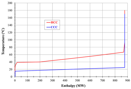 Furthermore, all investigated plant designs are the subject of in-depth thermal integration analysis in view of energy efficiency optimization [27]. To illustrate the thermal integration analysis, Figure 8 presents the composite curves (hot composite curve—HCC and cold composite curve—CCC) for the MDEA-based chemical scrubbing unit (Case 1.b). One can observe that the quantity of available heat is significantly large (coming mainly from the exothermic reaction heat between CO2 and amine) but the correspondent temperature is close to the ambient one, which means that this heat can only be removed with cooling water without contributing to the global energy efficiency. This aspect represents the most important drawback of chemical scrubbing technology used for CO2 capture in comparison to other decarbonization technologies which operate at higher temperatures (e.g., chemical/calcium looping).