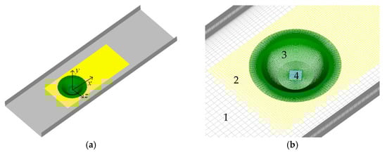 Area of the plane-parallel channel with a conical dimple on the heated wall (a) with the the Cartesian x,y,z coordinate system and multiblock grids in the vicinity of the dimple (b). 1—channel grid (CG); 2—refined Cartesian grid (wake grid—WG) covering the dimple, 3—O-shaped grid Ring inside the dimple, and 4—grid Rec—axial “patch”. The upper wall is removed.