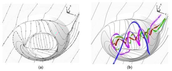 The streamlines in Figure 2a are the trajectories of the liquid particles in the layer of computational cells adjacent to the curvilinear wall with indication of their direction. The calculated streamlines are the experimental visualization of the air flow along the wall obtained with the use of soot–oil coatings. They allow analyzing the vortex structures of 3D separated near-wall flows.