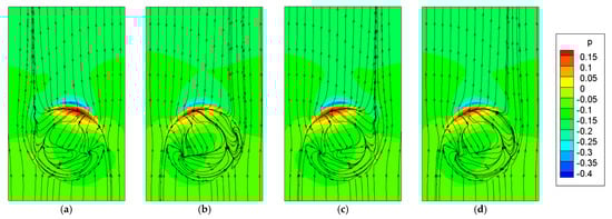 Calculated pressure fields and the source streamlines in the control area of the channel wall with the dimples for the considered standard SST models and the modified Menter SST models: (a) Menter 1993 SST model, (b) Menter 2003 SST model, (c) Menter SST model corrected according to RLI, and (d) Menter SST model corrected according to SM.