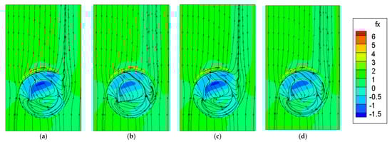 In Figure 4, the fields of the relative x-component friction in the projection onto the control plane, coinciding with the channel heated wall, refer to the same characteristics at the appropriate points on the non-dimpled wall of the plane-parallel channel. The air source streamlines (top view) are superimposed on the calculated fields of . The general features of the presented streamlines are the sharp flow acceleration in the low-pressure narrow regions just behind the dimples, where reaches a value of 8.