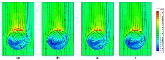Calculated fields of the relative Nusselt numbers and the source streamlines in the control area of the channel wall with the dimples for the different standard SST models and the modified Menter SST models: (a) Menter 1993 SST model, (b) Menter 2003 SST model, (c) Menter SST model corrected according to RLI, and (d) Menter SST model corrected according to SM.